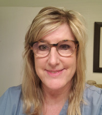 Blonde model in blue animal print dress, wearing a gold ring, thick gold bracelet, gold chain necklace, and gold earrings