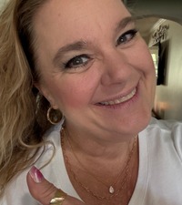Blonde model in blue animal print dress, wearing a gold ring, thick gold bracelet, gold chain necklace, and gold earrings